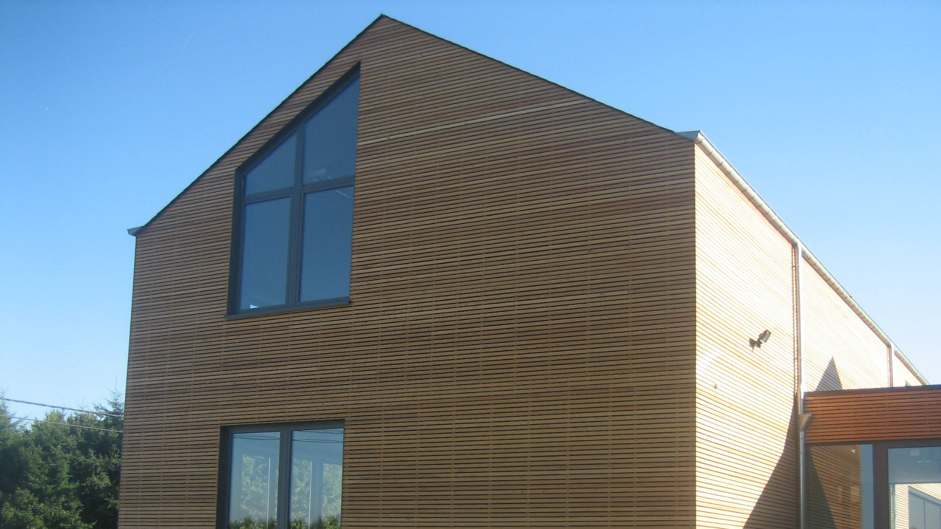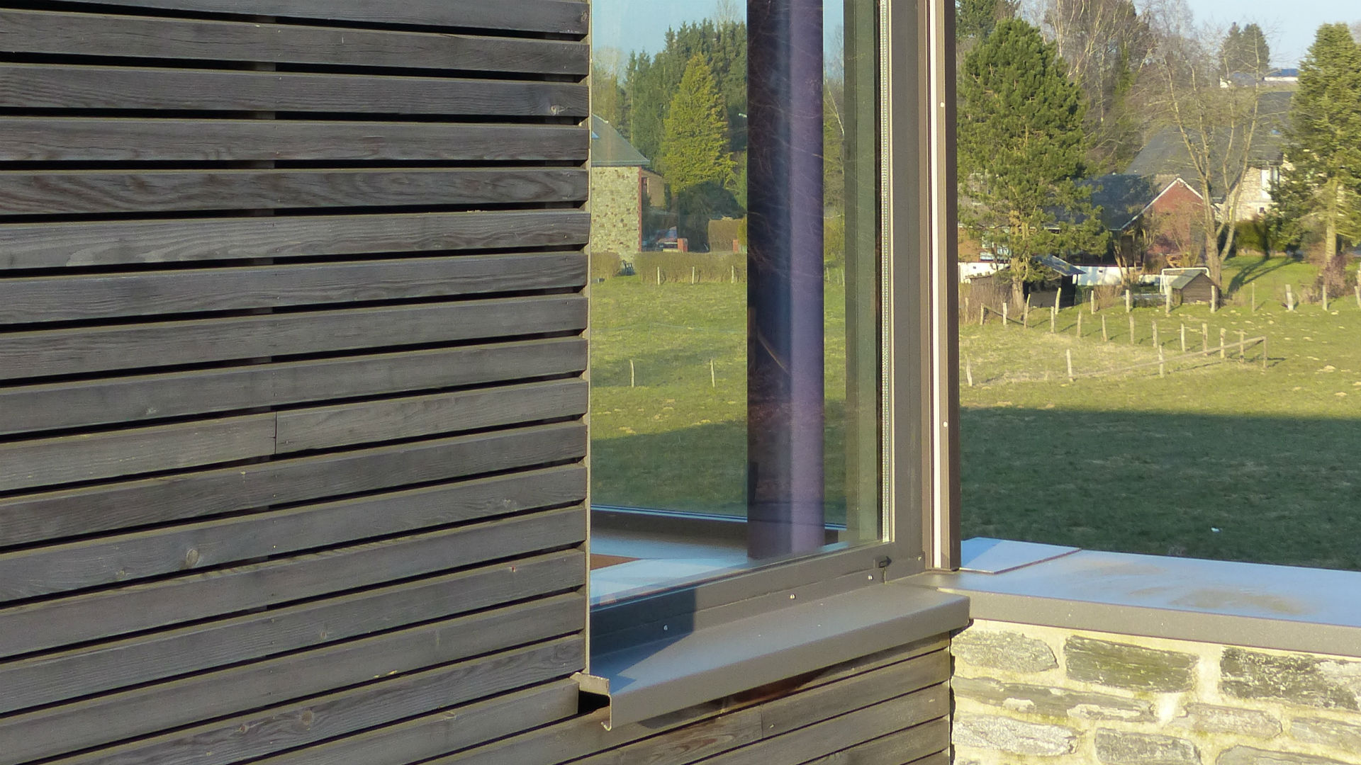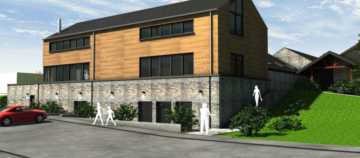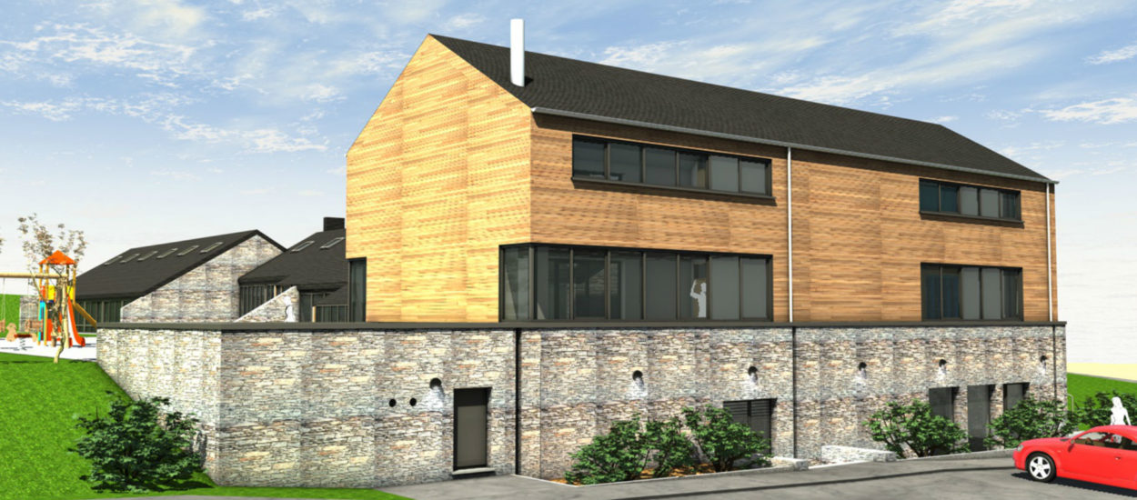 L'implantation, engendré par le manque d'espaces disponibles constructibles sur le talus avant, est faite entre le bâtiment existant et les stationnements. Le volume perpendiculaire à l'ensemble de la structure bâtie actuelle, devient un obstacle visuel clair entre la cour de récréation et la rue, tout en permettant un éclairement naturel de tous les locaux. Le sous-sol, ainsi partiellement enterré, bénéficie d'ouvertures de ventilation directe et d'accès privilégiés (salle, techniques). Le projet s'articule sur une circulation centrale (escalier et sanitaires) en élément dur et un espace tampon (toiture plate) qui a pour fonction le hall. Le reste du système constructif, hors sol, a été réalisé en ossature bois (non traité) avec isolation de cellulose insufflée et un bardage horizontal ajouré (mélèze ajouré). Cette extension requise par la commune de Gouvy, dans le cadre des programme Prioritaire des Travaux, a permis la réalisation d'une nouvelle classe maternelle, d'un réfectoire (rez), de deux classes primaires à l'étage et d'une salle commune attenant à la chaufferie à plaquettes de bois déchiquetés permet le chauffage de l'ensemble de l'implantation.